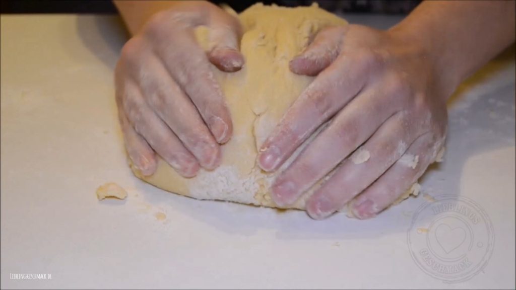 Den Teig in Frischhaltefolie. Bei 160 Grad Ober-Unterhitze 20 Minuten backen. Immer wieder mal in den Backofen schauen das.